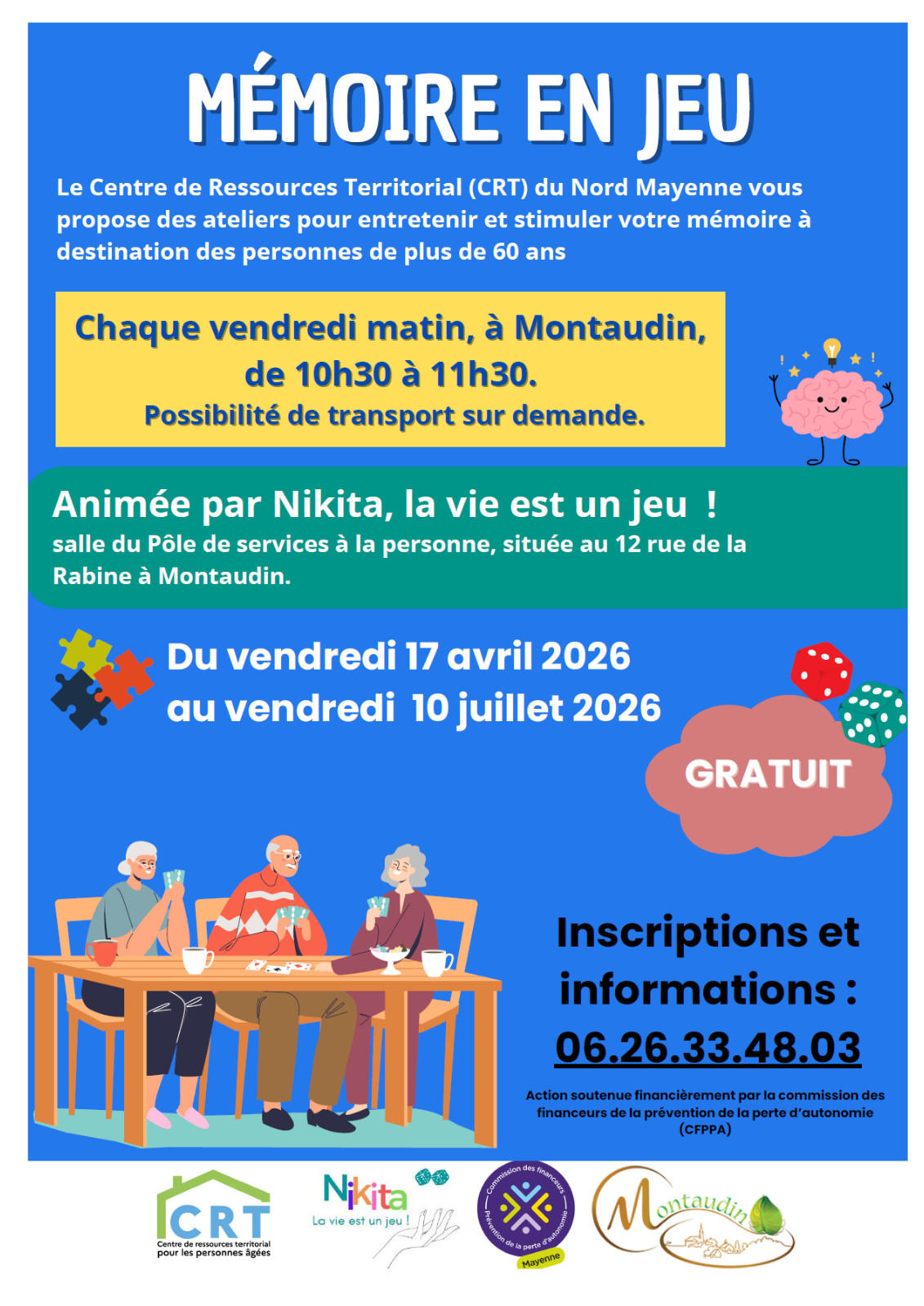 Atelier déridés et goûter partagé Séances de shiatsu(technique qui utilise les mains pour exercer des pressions) Vendredi 6 mars 2026Vendredi 17 avril 2026Vendredi 22 mai 2026 Groupe de 10 personnes et encadré par Mme DERENNES (Alliance shiatsu)