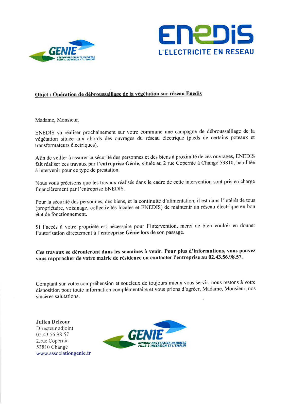 Campagne d'élagage réseau électrique haute tension ENEDIS va réaliser des travaux d'élagage et d'abattage à proximitédu réseau HTA qui alimente la commune Ces travaux sont réalisés par l'entreprise d'élagage JENOUVRIER ENVIRONNEMENT Pour tout rens
